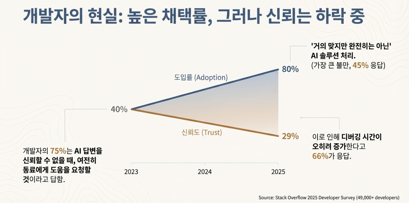 AI 코딩의 현실을 이해하는 첫 번째 열쇠는 이 도구들이 인간의 '비판적 검증' 능력을 그 어느 때보다 중요하게 만들고 있다는 점입니다. 이 역설은 충격적인 통계에서 명확히 드러납니다. Stack Overflow의 2025년 개발자 설문조사에 따르면, AI 코딩 도구 채택률은 무려 80%에 달합니다. 하지만 같은 기간, AI가 생성한 결과의 정확성에 대한 신뢰도는 이전의 40%에서 29%로 급락했습니다.