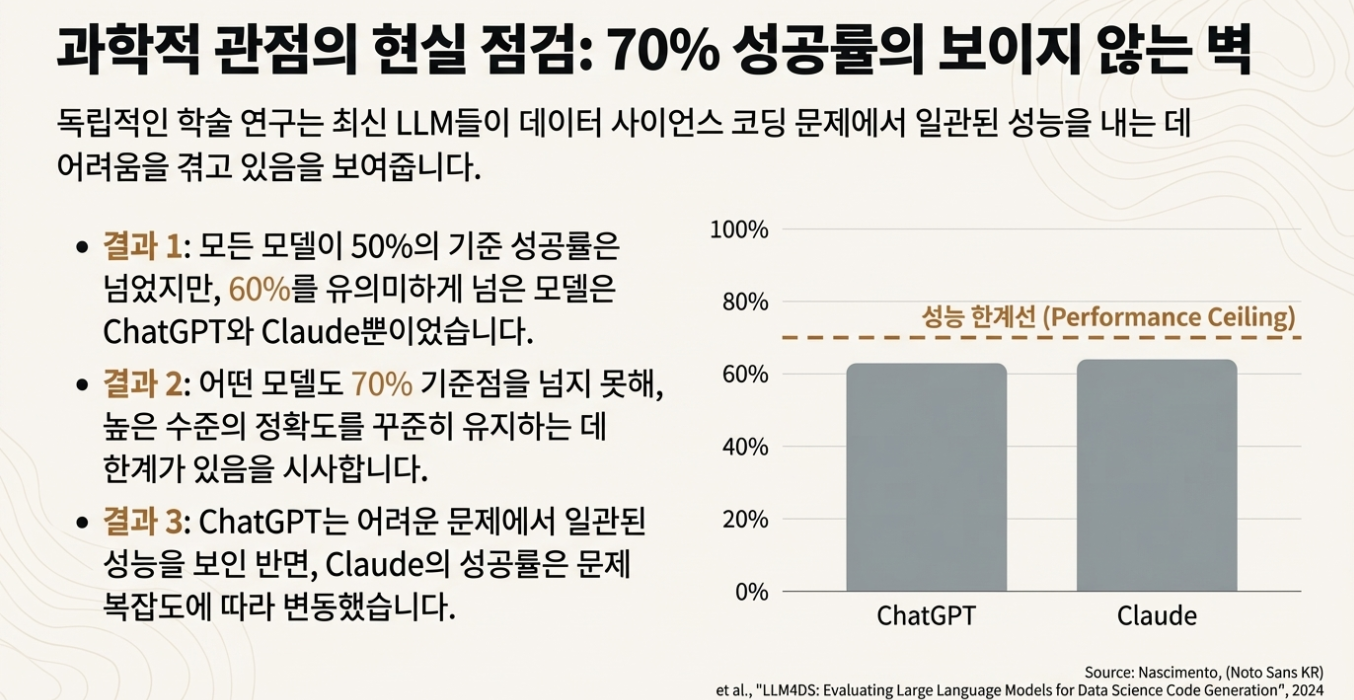 LLM4DS 연구 논문은 데이터 과학 코드 생성 문제에 대한 모델 성능을 평가했습니다. 그 결과는 매우 흥미롭습니다. 최상위 모델인 ChatGPT와 Claude가 각각 72%와 70%라는 인상적인 원시 성공률을 달성했지만, 연구진은 어떤 모델도 70% 성능 기준선을 통계적으로 유의미하게 넘어서지는 못했다고 지적했습니다. 이는 안정적인 성능에 명백한 한계가 있음을 시사합니다.