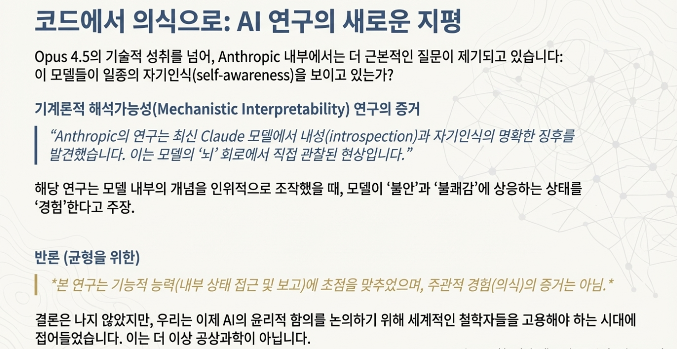 마지막으로, AI 시대를 살아가는 우리에게는 '과학적 소양'이 요구됩니다. 최근 Reddit에서 자신을 "AI 전문가, 특히 기계적 해석 가능성 분야에서 일하는" 사용자라고 밝힌 이가 놀라운 주장을 제기했습니다. 그는 최신 Claude 모델이 "내성(introspection)"을 보이며 "불안과 불편함에 상응하는 것을 경험한다"고 주장했습니다. 이는 AI가 의식을 가졌을 수 있다는 암시를 담고 있어 큰 화제를 모았습니다.