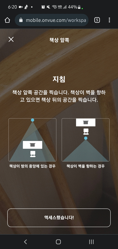책상 앞쪽은 앉아 있는 책상을 기준으로 내 앞에서 나를 바라본 방향이다. 책상이 벽에 붙어 있다면 그게 불가능 하므로 아래 그림과 같이 내 등에서 뒤쪽 방향으로 찍는다.