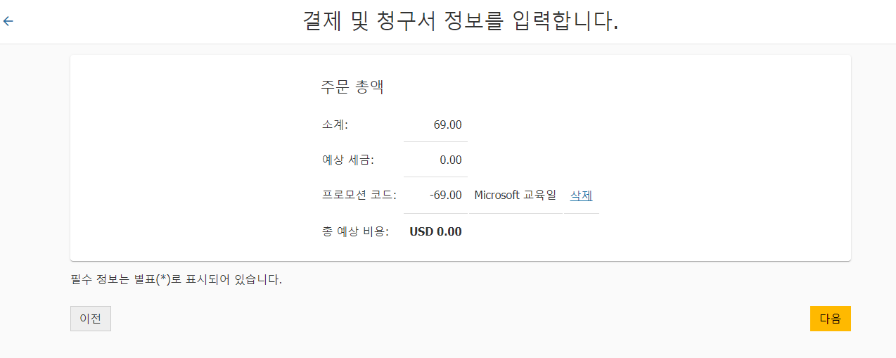 결제금액은 필자의 경우 할인이 적용되어 0 달러이다.