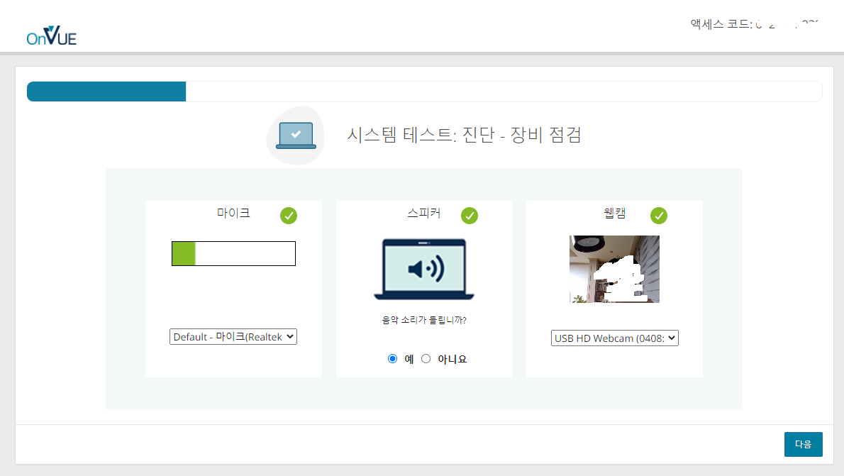 마이크, 스피커, 웹캠 테스트를 차례로 진행하여 모두 이상이 없으면 다음을 진행한다.