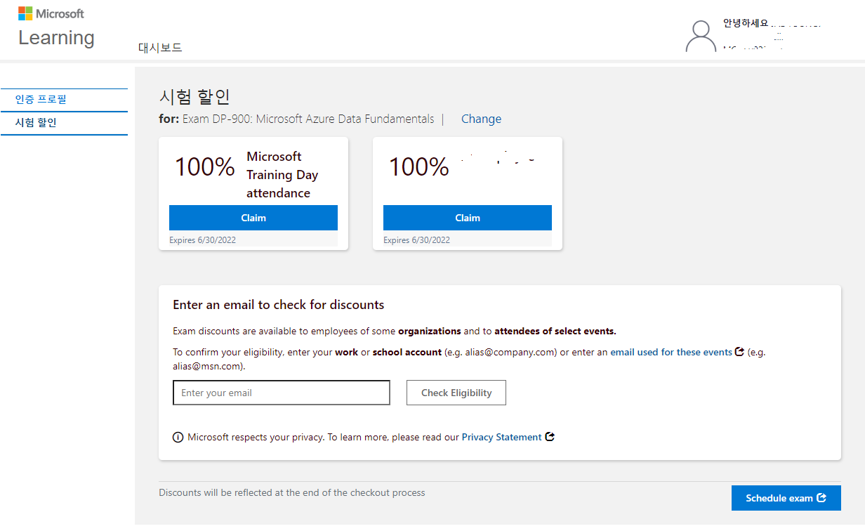 왼쪽은 Microsoft Training Day attendance 이고, 오른쪽은 필자가 다니는 회사를 통해 나오는 직원 할인이다.