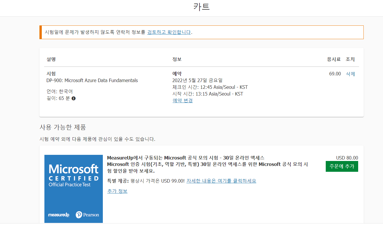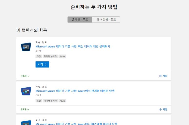 위 화면에서 사용 가능한 제품이라고 하여 모의시험을 별도록 구매하는 것이 있는데, 앞서 언급하였듯이 기본 인증시험의 경우는 MS에서 제공하는 기본 온라인 학습 정도로 충분하다고 생각한다.