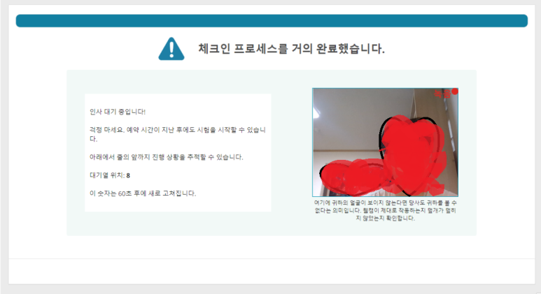 필자는 처음 응시 공간 촬영시 이상하게 촬영이 자꾸 매끄럽게 되지 않아 시간이 많이 소요됐었다. 시험 시작 시간은 다가오는데 이 부분에서 너무 지체돼서 등줄기에 땀이 날 정도록 긴장한 경험이 있다. 따라서 시작 시간 30분을 충분히 활용하여 일찍 체크인하는 게 중요하다.