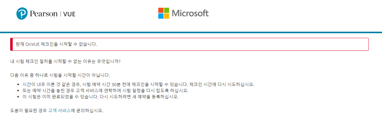 메일에 체크인 할 수 있는 링크가 있으므로 이를 클릭하여 들어가면 되겠다. 시험 시작 30분 이전에 클릭을 하면 아래와 같이 아직 불가하다는 메시지가 뜬다.