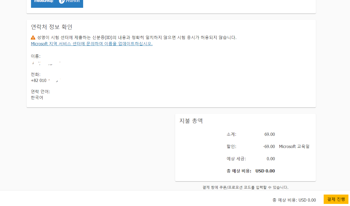 다음으로 시험 할인을 할 수 있는 정보가 나오는데, 아래 필자의 경우 두 가지 할인이 있다.