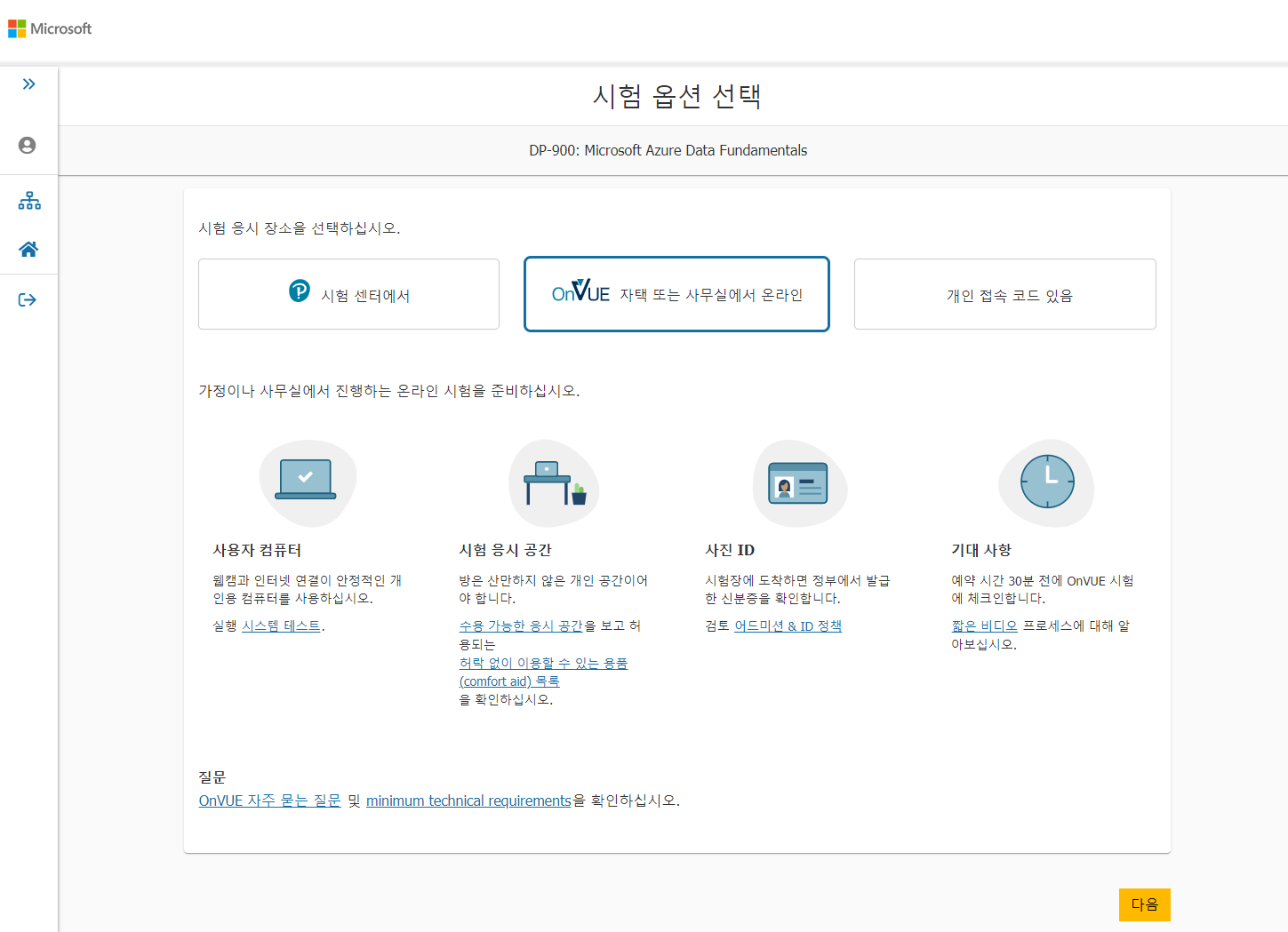 시험을 어디서 볼 건지 선택한다. [자택 또는 사무실에서 온라인]을 선택한다.